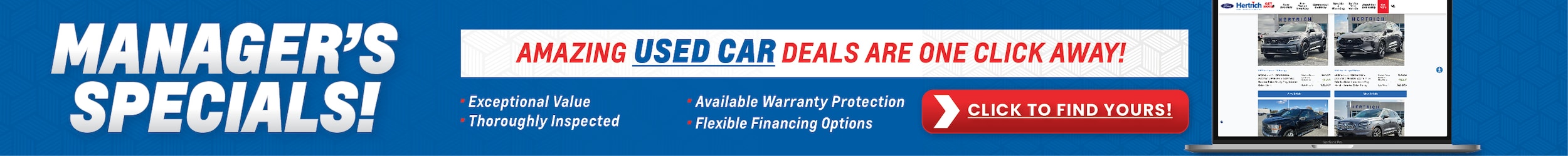 Discover exceptional pre-owned vehicles hand selected by our dealership managers at Hertrich Ford of Elkton. These great deals are priced to move and deliver outstanding value on quality used cars, trucks, and SUVs in Elkton, North East, Perryville, Rising Sun, Chesapeake City, Cecilton, and Newark, DE. Every pre-owned vehicle is thoroughly inspected, available with warranty options, and supported by flexible financing solutions to fit a wide range of budgets.